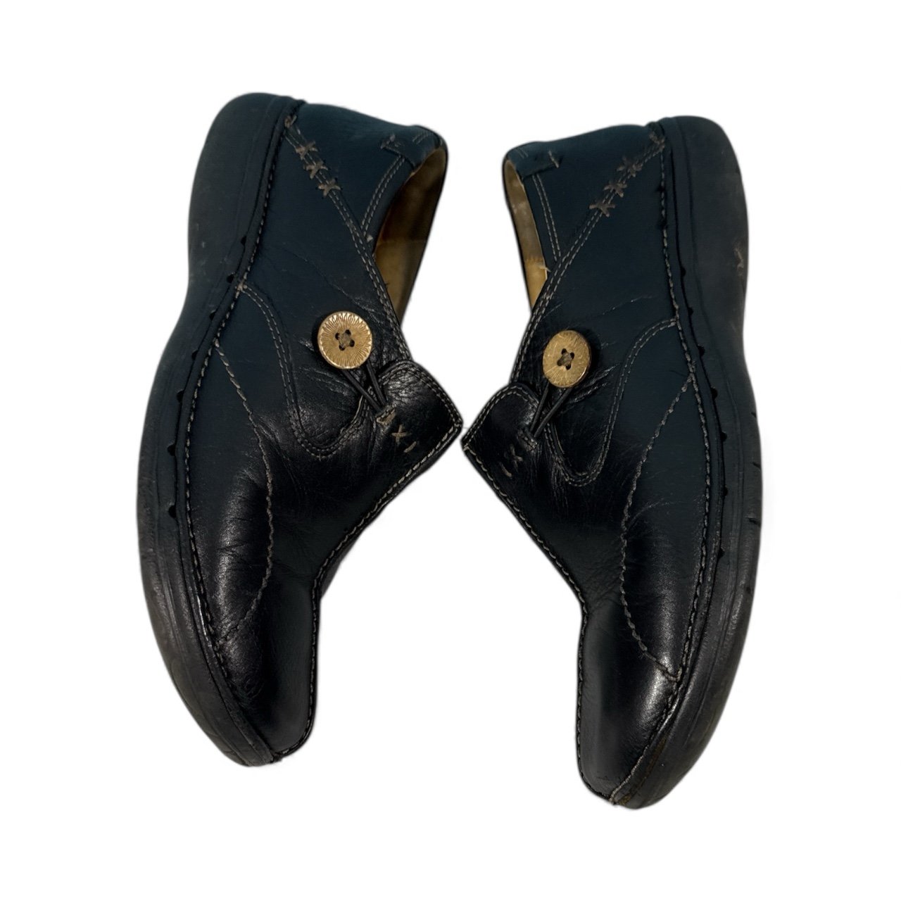 The Clarks Un Loop Unstructured Loafers in black leather are designed for women in size 8.5, featuring a round toe shape and slip-on closure for easy wear. These comfort shoes are perfect for casual, workwear, or travel occasions, with a flat heel height and rubber outsole for durability. The loafers are accented with buttons and the Clarks logo, offering a modern yet classic style suitable for all seasons. Made with high-quality leather lining and insole, these Clarks loafers provide both style and comfort for everyday wear.